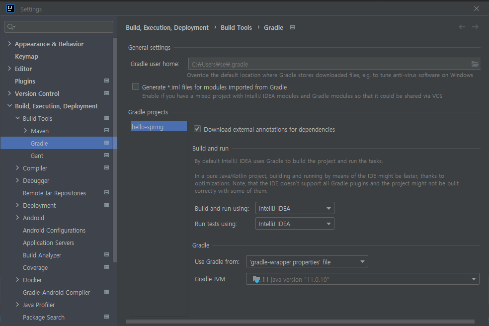 최근 IntelliJ 버전은 Gradle을 통해서 실행 하는 것이 기본 설정임.(이렇게 하면 실행속도가 느리다)