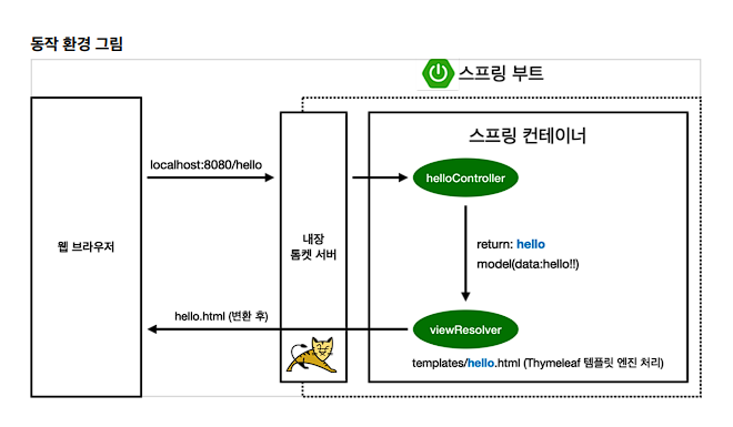 - 컨트롤러에서 리턴 값으로 문자를 반환하면 viewResolver 가 화면을 찾아서 처리한다.