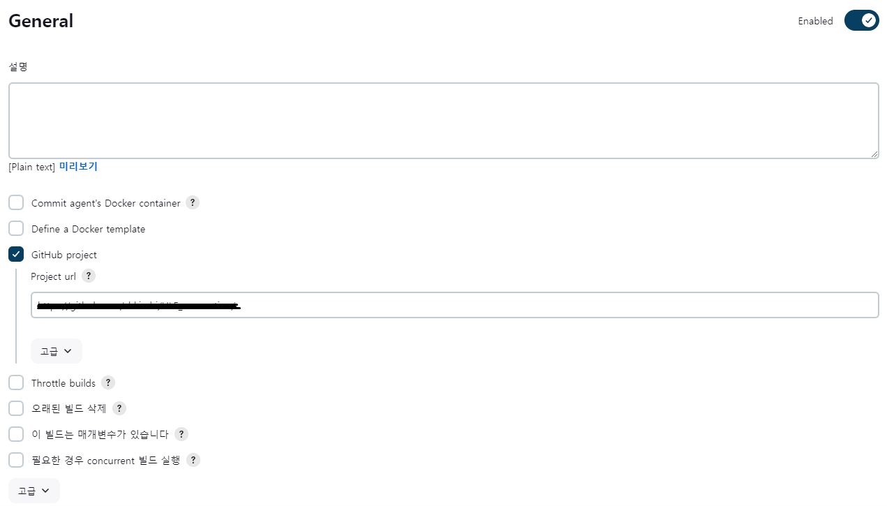 General 에서 Github project 선택 체크 후 Project url에 git repository url 입력