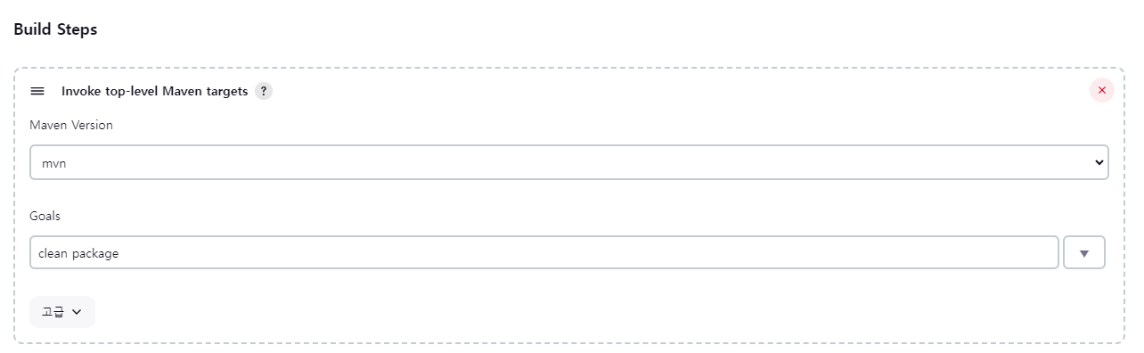 빌드 스텝에서 Maven Version 에 mvn, Goals 에 clean package