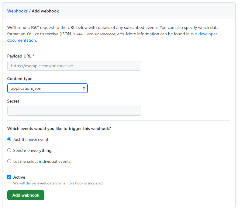 Payload URL에 외부 접속 가능한 Jenkins 주소 입력 ( ngrok 링크 입력 ) 후 뒤에 /github-webhook/ 입력 . ( /github-webhook/ 입력 안할 시 Fobidden 에러 발생 )