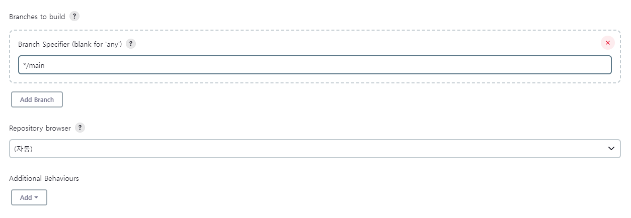 소스코드 관리에서 Git 선택 후 Repository URL에 git repository url 입력