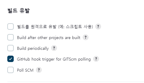 빌드 유발에 GitHub hook trigger for GITScm polling 선택