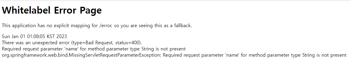 WARN 16500 --- [nio-8080exec2] .w.s.m.s.DefaultHandlerExceptionResolver : Resolved[org.springframework.web.bind.MissingServletRequestParameterException: Required request parameter 'name' for method parameter type String is not present]